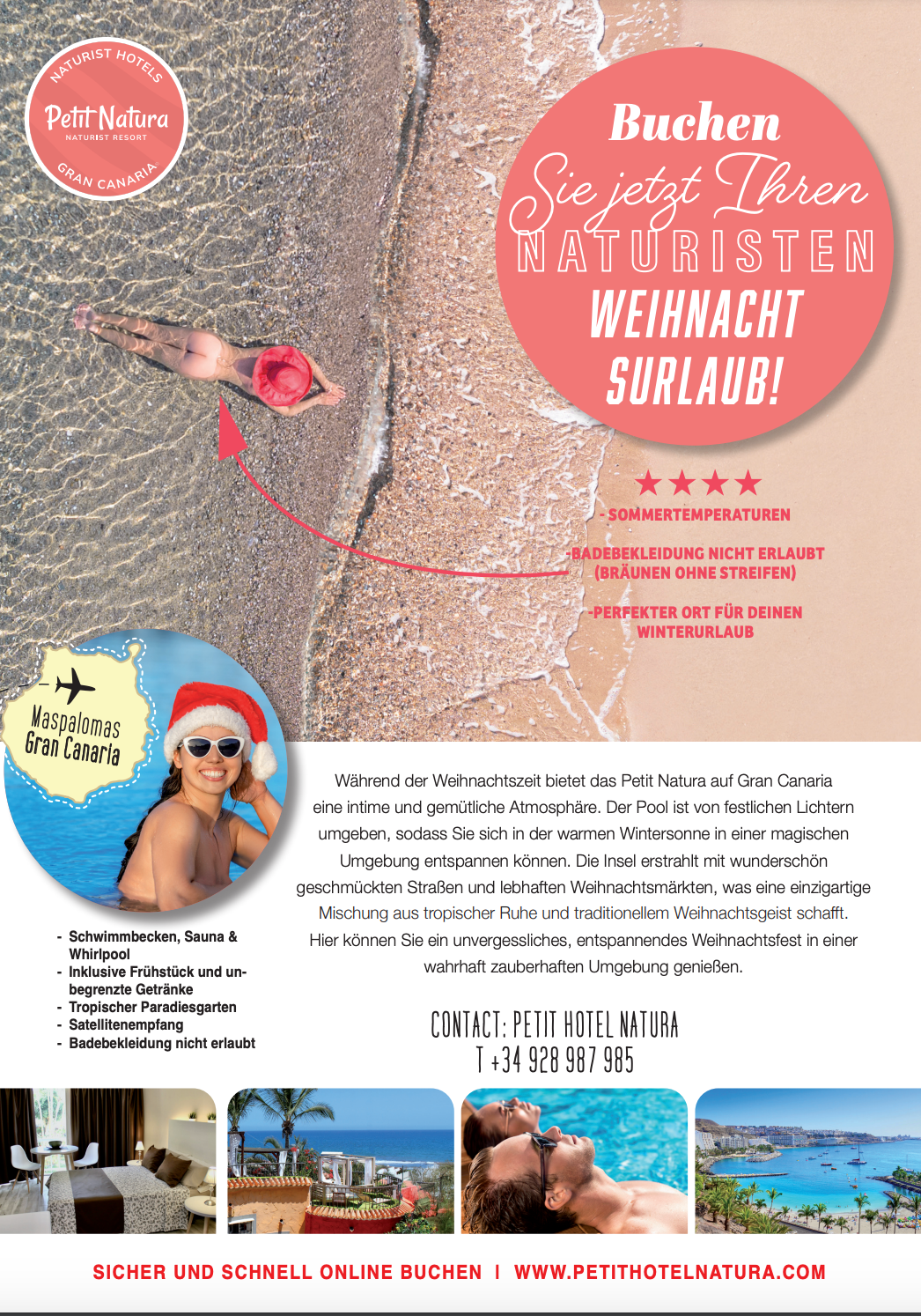 Bereite dich auf einen FKK-Weihnachtsurlaub und einen Neujahrs-Tauchgang vor – ein unvergesslicher FKK-Weihnachtsurlaub unter der strahlenden Sonne. Gran Canaria, eine der atemberaubendsten Kanarischen Inseln, ist das ultimative Traumziel für FKK-Liebhaber, die während der Feiertage Entspannung und Freiheit suchen. Die Südostküste mit den beliebten Ferienorten Maspalomas und Playa del Inglés bietet alles, was du für den perfekten FKK-Weihnachtsurlaub und eine sonnenverwöhnte Neujahrsfeier voller unbeschwertem Genuss benötigst.